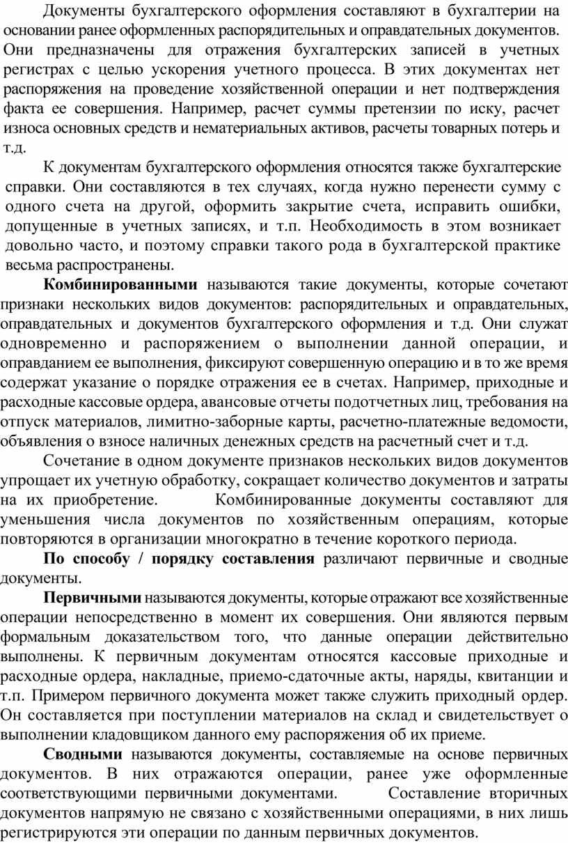Сочетание в одном документе признаков нескольких видов документов упрощает их учетную обработку, сокращает количество документов и затраты на их приобретение. Комбинированные документы составляют для уменьшения числа документов по хозяйственным операциям, которые повторяются в организации многократно в течение короткого периода.