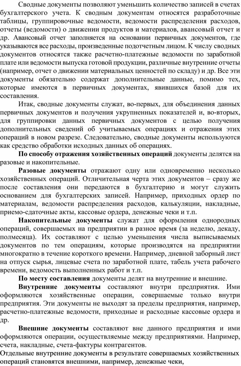 Итак, сводные документы служат, во-первых, для объединения данных первичных документов и получения укрупненных показателей и, во-вторых, для группировки данных первичных документов с целью получения дополнительных сведений об учитываемых операциях и отражения этих операций в новом разрезе. Следовательно, сводные документы используются как средство обработки исходных данных об операциях.