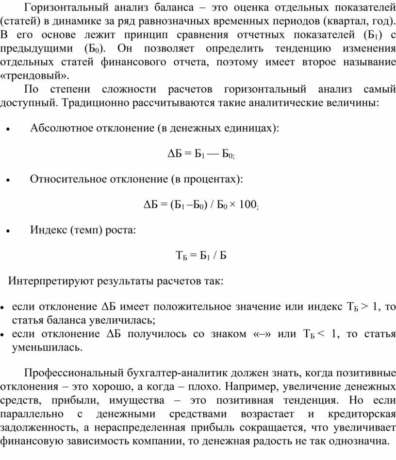 · если отклонение ΔБ имеет положительное значение или индекс ТБ ˃ 1, то статья баланса увеличилась;