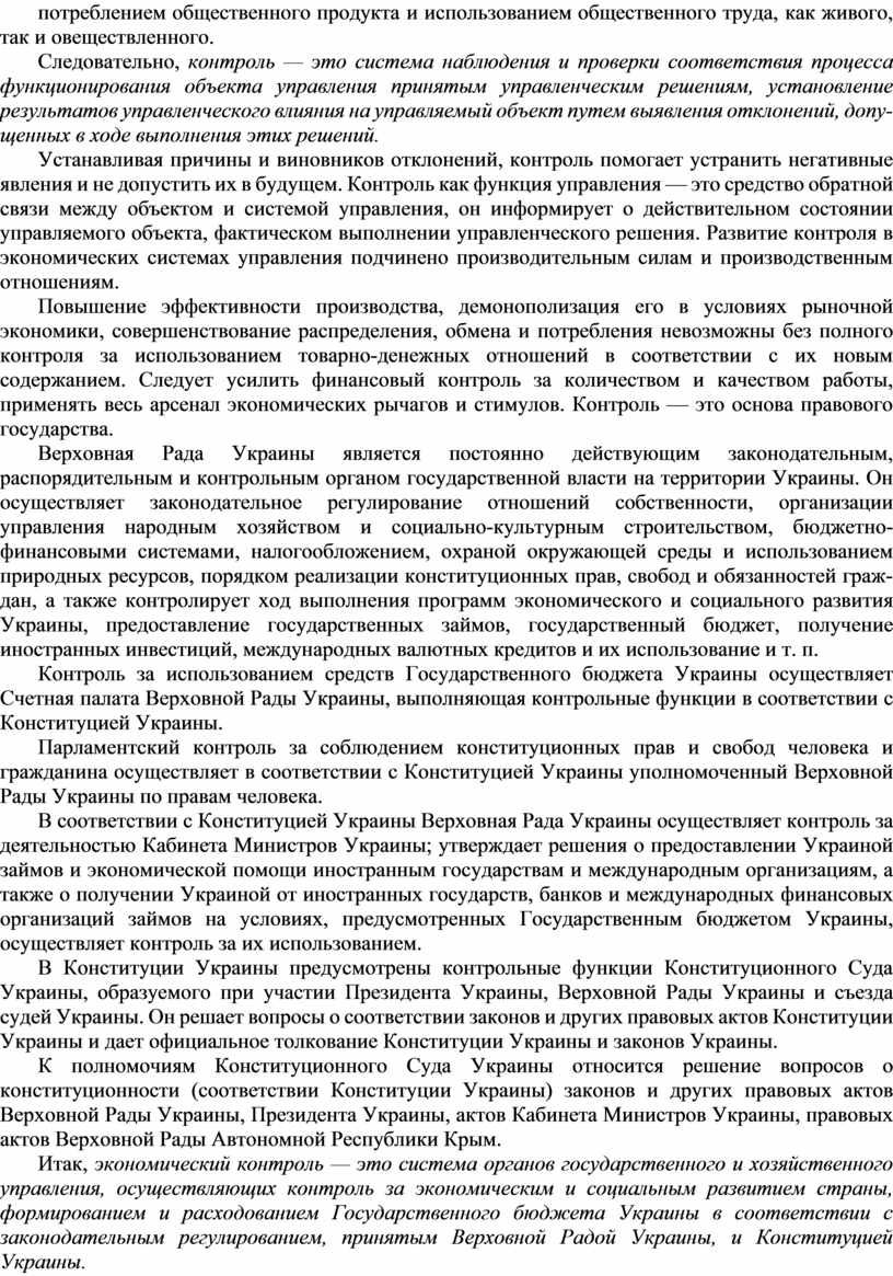 Итак, экономический контроль — это система органов государственного и хозяйственного управления, осуществляющих контроль за экономическим и социальным развитием страны, формированием и расходованием Государственного бюджета Украины в соответствии с законодательным регулированием, принятым Верховной Радой Украины, и Конституцией Украины.