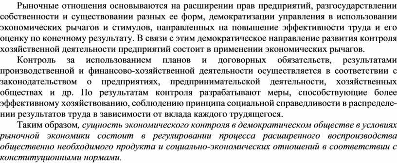 Таким образом, сущность экономического контроля в демократическом обществе в условиях рыночной экономики состоит в регулировании процесса расширенного воспроизводства общественно необходимого продукта и социально-экономических отношений в соответствии с конституционными нормами.