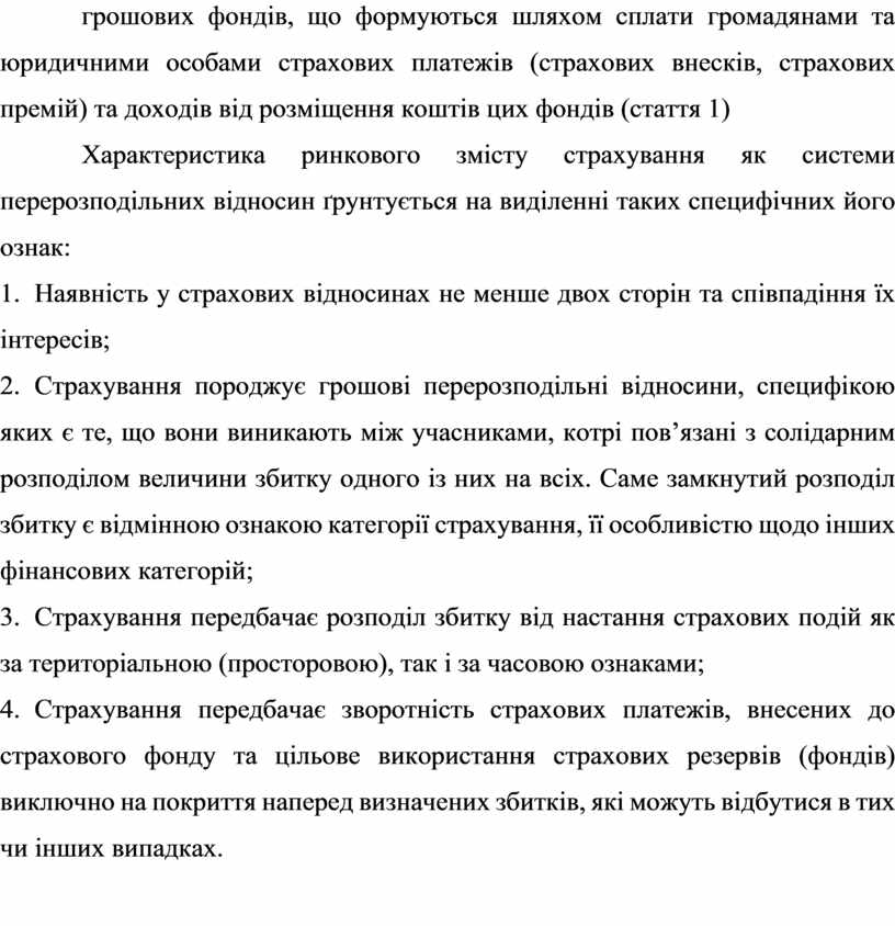 Характеристика ринкового змісту страхування як системи перерозподільних відносин ґрунтується на виділенні таких специфічних його ознак: