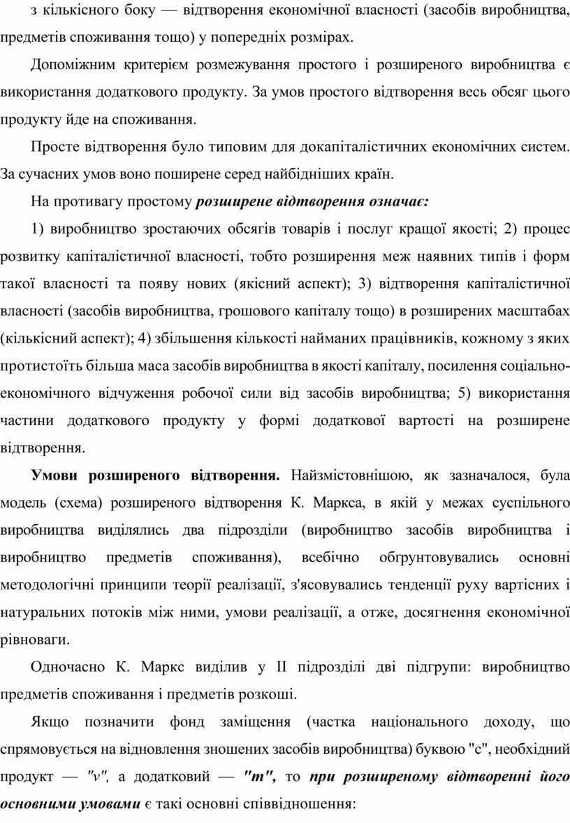 Умови розширеного відтворення. Найзмістовнішою, як зазначалося, була модель (схема) розширеного відтворення К. Маркса, в якій у межах суспільного виробництва виділялись два підрозділи (виробництво засобів виробництва і виробництво предметів споживання), всебічно обґрунтовувались основні методологічні принципи теорії реалізації, з'ясовувались тенденції руху вартісних і натуральних потоків між ними, умови реалізації, а отже, досягнення економічної рівноваги.