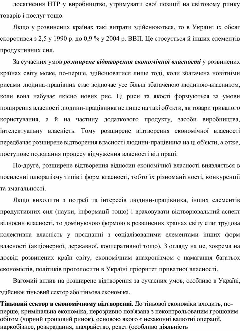 В Україні у 90-х роках посилилася деградація процесу відтворення робочої сили, що виявилося, по-перше, у зниженні народжуваності та зростанні смертності населення; по-друге, в зниженні калорійності харчування; по-третє, у зростанні середніх витрат сім'ї на харчування з приблизно ЗО % у 1989 р. до понад 80 % у 2000 p., до понад 60 % у 2004 p.; по-четверте, у зростаючому відчуженні найманих працівників від власності в процесі номенклатурно-тіньової приватизації і роздержавлення; по-п'яте, у значному ослабленні здоров'я нації (майже 70 % працівників народного господарства мають різні хронічні захворювання та функціональні порушення нервової системи і внутрішніх органів). Для розширеного відтворення науки за сучасних умов необхідно здійснювати витрати на науку в обсязі приблизно 2,5— З % від величини ВНП. Тільки за цих умов держава спроможна розвивати науково-дослідні й дослідно-конструкторські розробки, впроваджувати досягнення НТР у виробництво, утримувати свої позиції на світовому ринку товарів і послуг тощо.