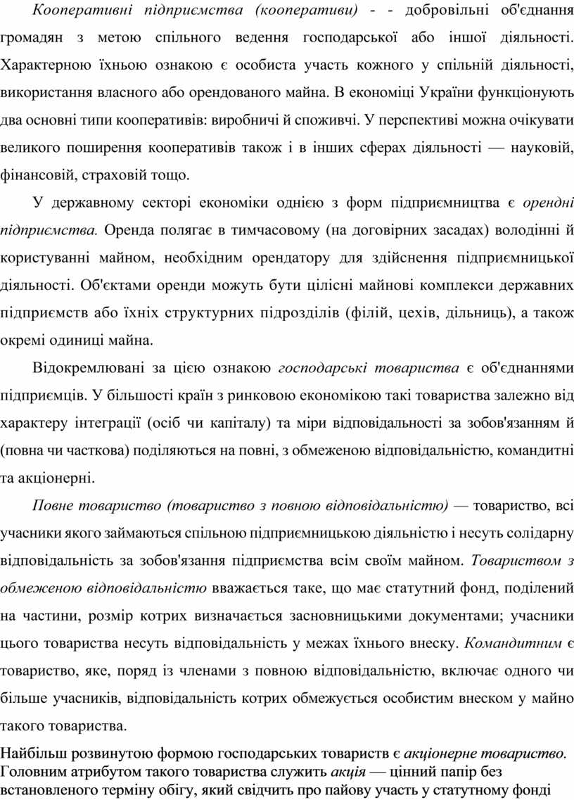 Кооперативні підприємства (кооперативи) - - добровільні об'єднання громадян з метою спільного ведення господарської або іншої діяльності. Характерною їхньою ознакою є особиста участь кожного у спільній діяльності, використання власного або орендованого майна. В економіці України функціонують два основні типи кооперативів: виробничі й споживчі. У перспективі можна очікувати великого поширення кооперативів також і в інших сферах діяльності — науковій, фінансовій, страховій тощо.