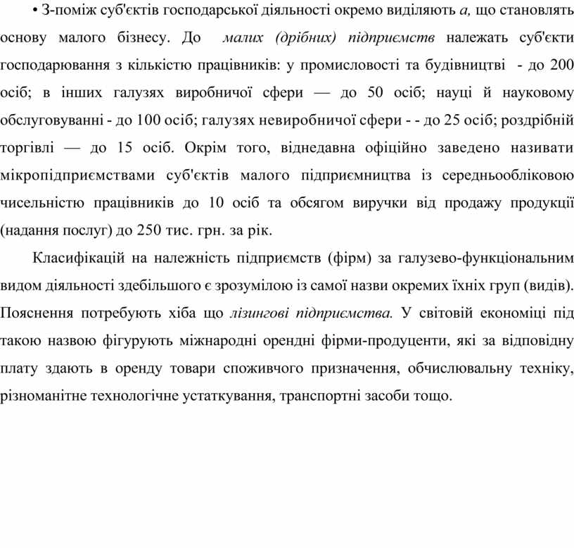 • З-поміж суб'єктів господарської діяльності окремо виділяють а, що становлять основу малого бізнесу. До малих (дрібних) підприємств належать суб'єкти господарювання з кількістю працівників: у промисловості та будівництві - до 200 осіб; в інших галузях виробничої сфери — до 50 осіб; науці й науковому обслуговуванні - до 100 осіб; галузях невиробничої сфери - - до 25 осіб; роздрібній торгівлі — до 15 осіб. Окрім того, віднедавна офіційно заведено називати мікропідприємствами суб'єктів малого підприємництва із середньообліковою чисельністю працівників до 10 осіб та обсягом виручки від продажу продукції (надання послуг) до 250 тис. грн. за рік.