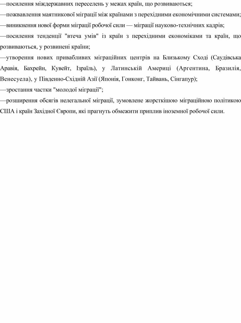 Тенденції розвитку ММРС: — поширення міграційних процесів робочої сили практично на всі країни світу; |
