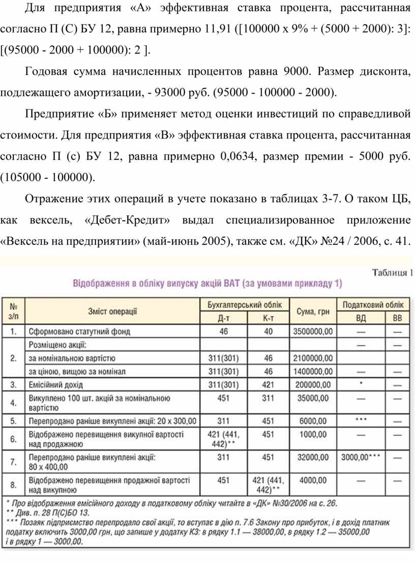 Предприятие «Б» применяет метод оценки инвестиций по справедливой стоимости. Для предприятия «В» эффективная ставка процента, рассчитанная согласно П (с) БУ 12, равна примерно 0,0634, размер премии - 5000 руб. (105000 - 100000).