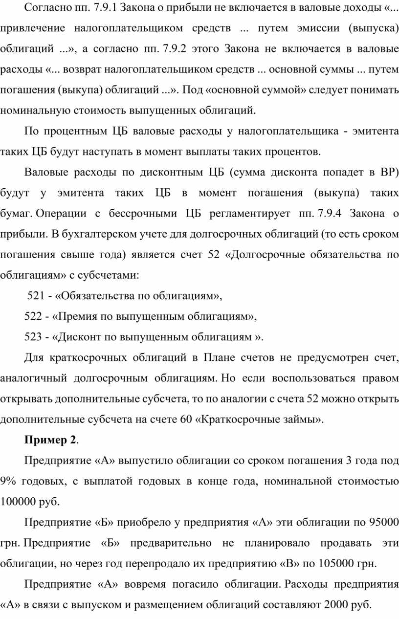 Валовые расходы по дисконтным ЦБ (сумма дисконта попадет в ВР) будут у эмитента таких ЦБ в момент погашения (выкупа) таких бумаг. Операции с бессрочными ЦБ регламентирует пп. 7.9.4 Закона о прибыли. В бухгалтерском учете для долгосрочных облигаций (то есть сроком погашения свыше года) является счет 52 «Долгосрочные обязательства по облигациям» с субсчетами: