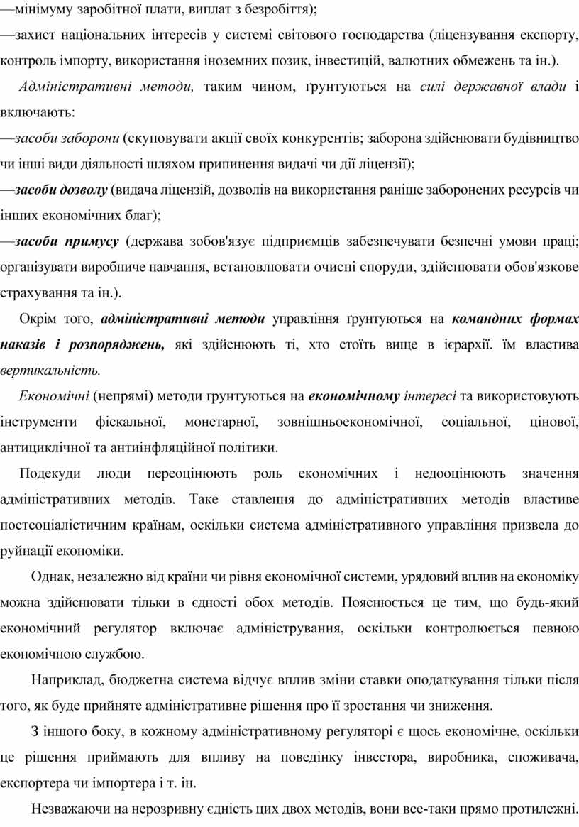 Економічні (непрямі) методи ґрунтуються на економічному інтересі та використовують інструменти фіскальної, монетарної, зовнішньоекономічної, соціальної, цінової, антициклічної та антиінфляційної політики.