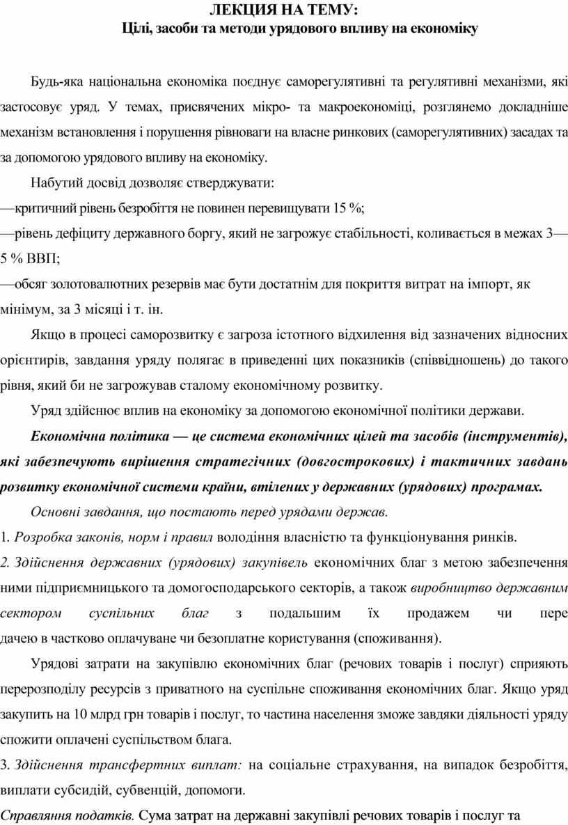 Уряд здійснює вплив на економіку за допомогою економічної політики держави.
