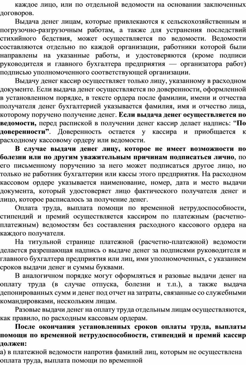 Оплата труда, выплата помощи по временной нетрудоспособности, стипендий и премий осуществляется кассиром по платежным (расчетно-платежным) ведомостям без составления расходного кассового ордера на каждого получателя.