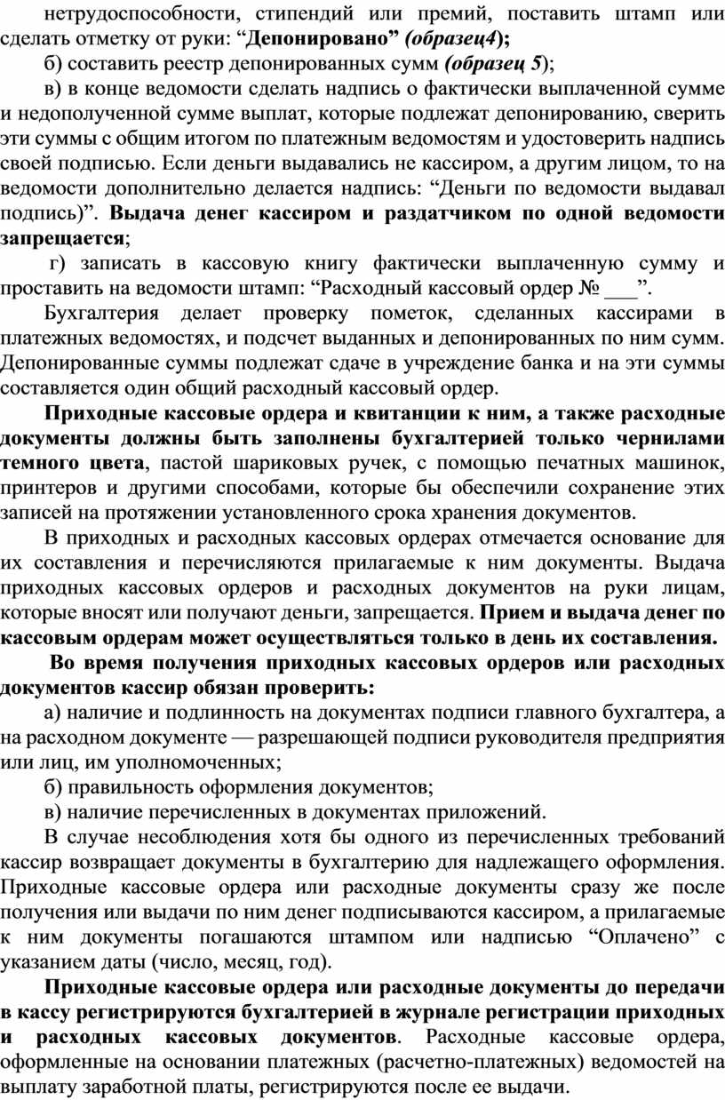 Бухгалтерия делает проверку пометок, сделанных кассирами в платежных ведомостях, и подсчет выданных и депонированных по ним сумм. Депонированные суммы подлежат сдаче в учреждение банка и на эти суммы составляется один общий расходный кассовый ордер.