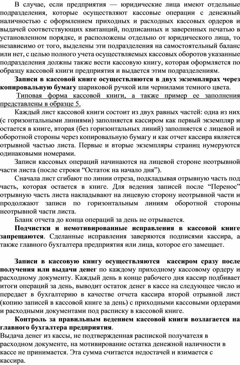 В случае, если предприятия — юридические лица имеют отдельные подразделения, которые осуществляют кассовые операции с денежный наличностью с оформлением приходных и расходных кассовых ордеров и выдачей соответствующих квитанций, подписанных и заверенных печатью в установленном порядке, и расположены отдельно от юридического лица, то независимо от того, выделены эти подразделения на самостоятельный баланс или нет, с целью полного учета осуществляемых кассовых оборотов указанные подразделения должны также вести кассовую книгу, которая оформляется по образцу кассовой книги предприятия и выдается этим подразделениям.