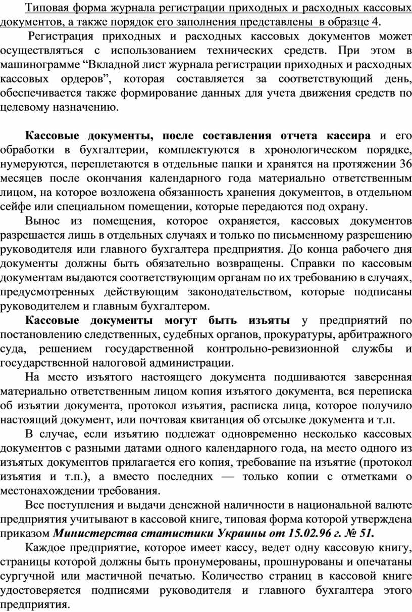 Типовая форма журнала регистрации приходных и расходных кассовых документов, а также порядок его заполнения представлены в образце 4.