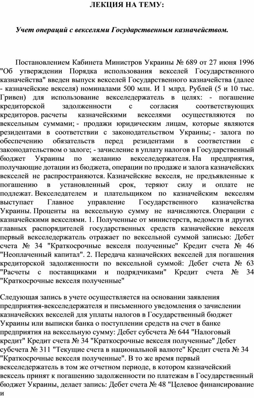 Постановлением Кабинета Министров Украины № 689 от 27 июня 1996 "Об утверждении Порядка использования векселей Государственного казначейства" введен выпуск векселей Государственного казначейства (далее - казначейские векселя) номиналами 500 млн. И 1 млрд. Рублей (5 и 10 тыс. Гривен) для использование векселедержатель в целях: - погашение кредиторской задолженности с согласия соответствующих кредиторов. расчеты казначейскими векселями осуществляются по вексельным суммами; - продажи юридическим лицам, которые являются резидентами в соответствии с законодательством Украины; - залога по обеспечению обязательств перед резидентами в соответствии с законодательством о залоге; - зачисление в уплату налогов в Государственный бюджет Украины по желанию векселедержателя. На предприятия, получающие дотации из бюджета, операции по продаже и залога казначейских векселей не распространяются. Казначейские векселя, не предъявленные к погашению в установленный срок, теряют силу и оплате не подлежат. Векселедателем и плательщиком по казначейским векселям выступает Главное управление Государственного казначейства Украины. Проценты на вексельную сумму не начисляются. Операции с казначейскими векселями. 1. Полученные от министерств, ведомств и других главных распорядителей государственных средств казначейские векселя первый векселедержатель отражает по вексельной суммой записью: Дебет счета № 34 "Краткосрочные векселя полученные" Кредит счета № 46 "Неоплаченный капитал". 2. Передача казначейских векселей для погашения кредиторской задолженности по вексельной суммой: Дебет счета № 63 "Расчеты с поставщиками и подрядчиками" Кредит счета № 34 "Краткосрочные векселя полученные"