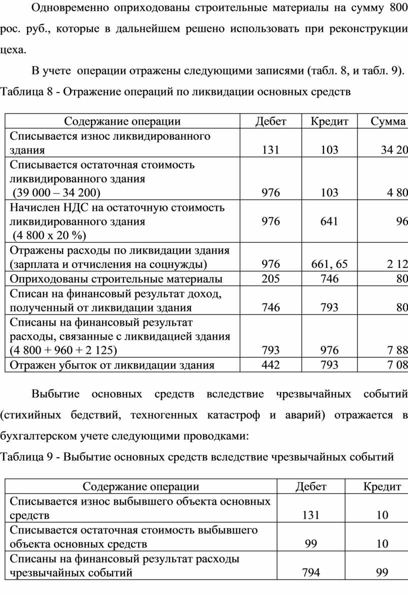 Таблица 8 - Отражение операций по ликвидации основных средств