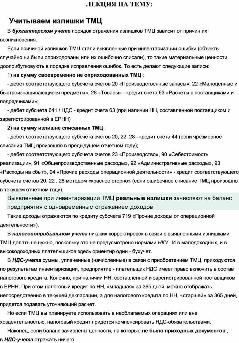 Выявленные при инвентаризации ТМЦ реальные излишки зачисляют на баланс предприятия с одновременным отражением доходов