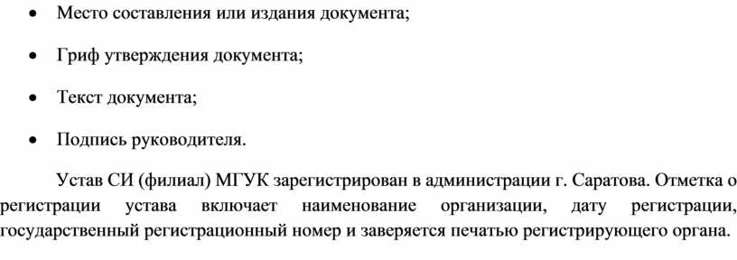 Устав СИ (филиал) МГУК зарегистрирован в администрации г. Саратова. Отметка о регистрации устава включает наименование организации, дату регистрации, государственный регистрационный номер и заверяется печатью регистрирующего органа.