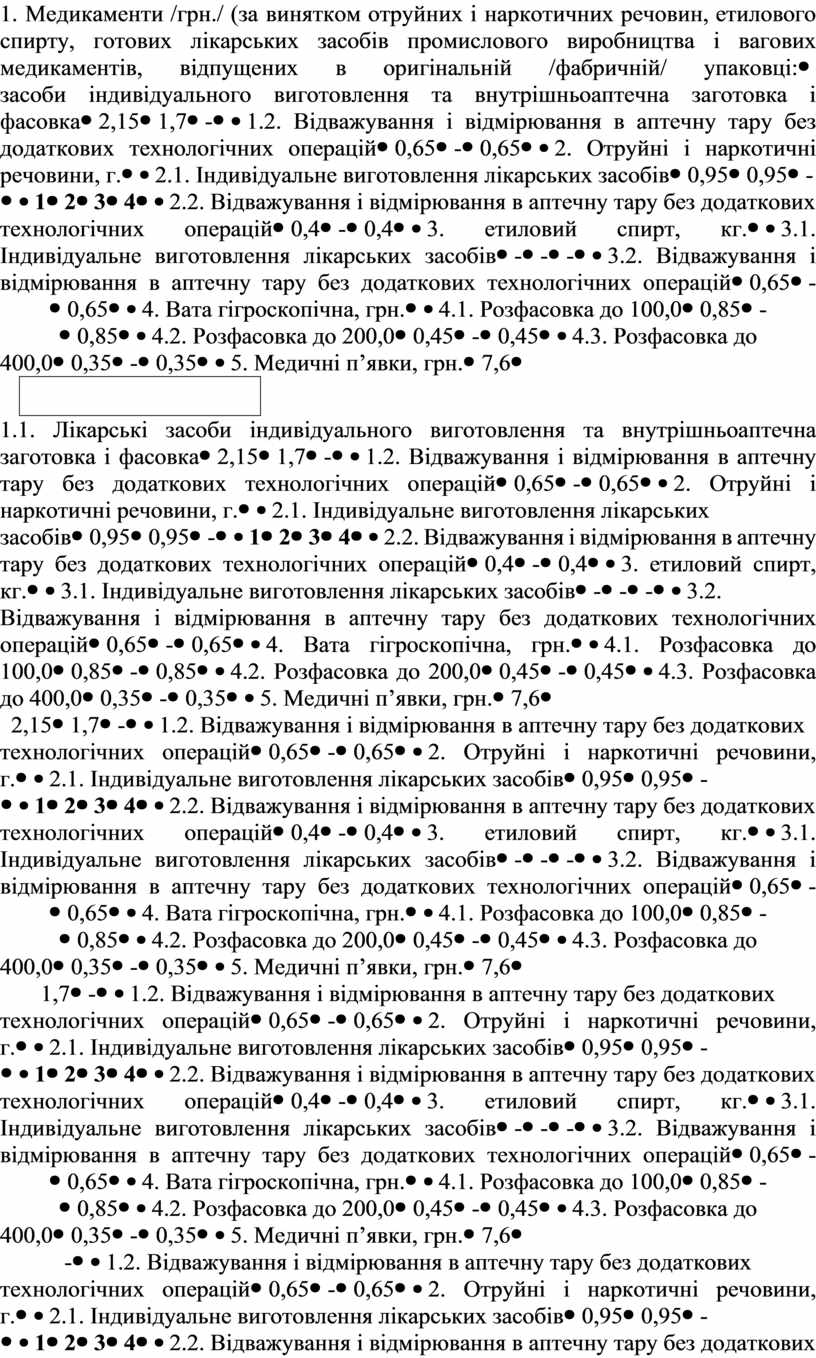 1. Медикаменти /грн./ (за винятком отруйних і наркотичних речовин, етилового спирту, готових лікарських засобів промислового виробництва і вагових медикаментів, відпущених в оригінальній /фабричній/ упаковці: |