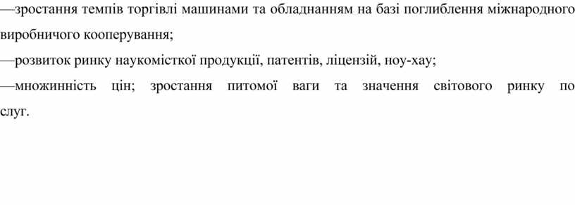 —зміна структури товарообігу світової торгівлі за рахунок зростання питомої ваги продукції переробної промисловості; зниження частки сировинних товарів;