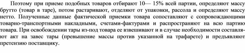 Выборочные наблюдения применяют также при приеме крупной партии товаров в торговую сеть в затаренном виде. Например, в предприятие розничной торговли поступила крупная партия сельди в бочковой таре от поставщика. Открывать все бочки, сцеживать рассол, а потом взвешивать, чтобы определить массу сельди нетто, невозможно. Во-первых, это очень трудоемкая операция, во-вторых, растаренная сельдь при длительной реализации теряет товарное качество. Поэтому при приеме подобных товаров отбирают 10— 15% всей партии, определяют массу брутто (товар в таре), потом растаривают, отделяют от упаковки, рассола и определяют массу нетто. Полученные данные фактической приемки товара сопоставляют с сопровождающими товарно-транспортными накладными, счетами-фактурами и распространяют на всю партию товара. При освобождении тары из-под товара ее взвешивают и в случае необходимости составляют акт на завес тары (превышение массы против указанной на трафарете) и предъявляют претензию поставщику.