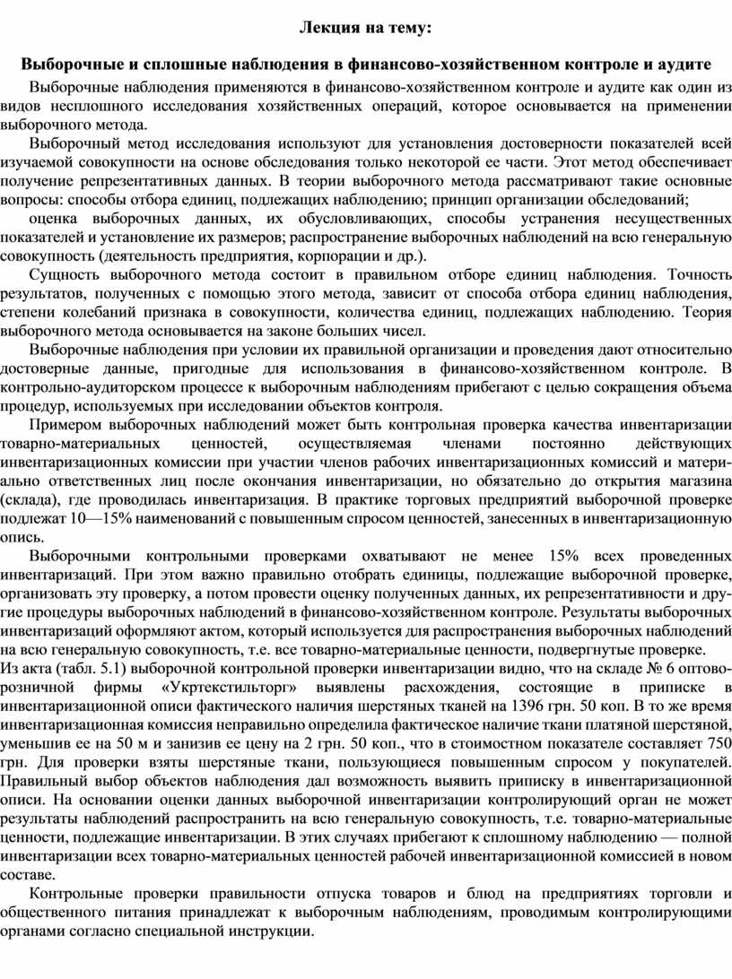 Из акта (табл. 5.1) выборочной контрольной проверки инвентаризации видно, что на складе № 6 оптово-розничной фирмы «Укртекстильторг» выявлены расхождения, состоящие в приписке в инвентаризационной описи фактического наличия шерстяных тканей на 1396 грн. 50 коп. В то же время инвентаризационная комиссия неправильно определила фактическое наличие ткани платяной шерстяной, уменьшив ее на 50 м и занизив ее цену на 2 грн. 50 коп., что в стоимостном показателе составляет 750 грн. Для проверки взяты шерстяные ткани, пользующиеся повышенным спросом у покупателей. Правильный выбор объектов наблюдения дал возможность выявить приписку в инвентаризационной описи. На основании оценки данных выборочной инвентаризации контролирующий орган не может результаты наблюдений распространить на всю генеральную совокупность, т.е. товарно-материальные ценности, подлежащие инвентаризации. В этих случаях прибегают к сплошному наблюдению — полной инвентаризации всех товарно-материальных ценностей рабочей инвентаризационной комиссией в новом составе.
