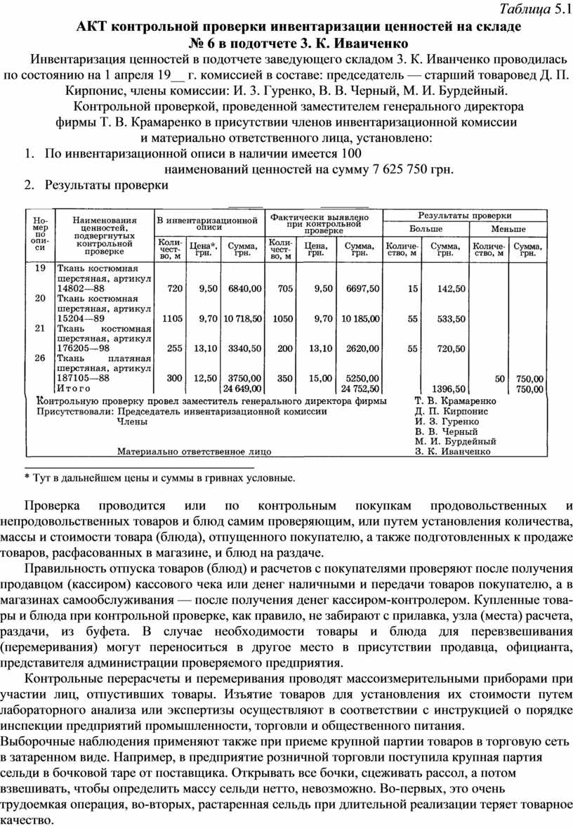 Контрольной проверкой, проведенной заместителем генерального директора фирмы Т. В. Крамаренко в присутствии членов инвентаризационной комиссии и материально ответственного лица, установлено: