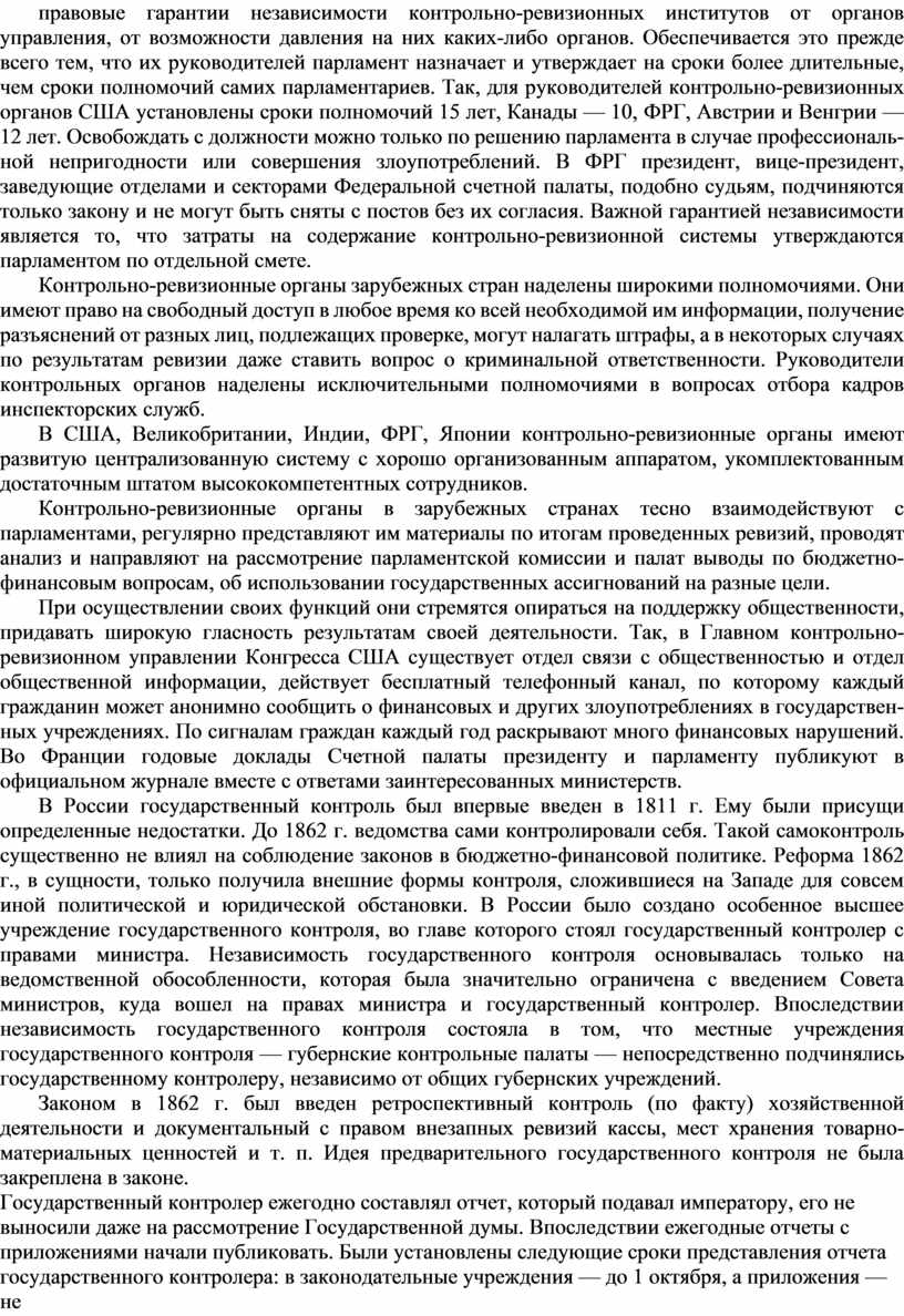 В России государственный контроль был впервые введен в 1811 г. Ему были присущи определенные недостатки. До 1862 г. ведомства сами контролировали себя. Такой самоконтроль существенно не влиял на соблюдение законов в бюджетно-финансовой политике. Реформа 1862 г., в сущности, только получила внешние формы контроля, сложившиеся на Западе для совсем иной политической и юридической обстановки. В России было создано особенное высшее учреждение государственного контроля, во главе которого стоял государственный контролер с правами министра. Независимость государственного контроля основывалась только на ведомственной обособленности, которая была значительно ограничена с введением Совета министров, куда вошел на правах министра и государственный контролер. Впоследствии независимость государственного контроля состояла в том, что местные учреждения государственного контроля — губернские контрольные палаты — непосредственно подчинялись государственному контролеру, независимо от общих губернских учреждений.