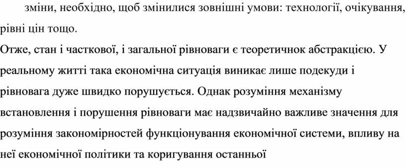 Отже, стан і часткової, і загальної рівноваги є теоретичнок абстракцією. У реальному житті така економічна ситуація виникає лише подекуди і рівновага дуже швидко порушується. Однак розуміння механізму встановлення і порушення рівноваги має надзвичайно важливе значення для розуміння закономірностей функціонування економічної системи, впливу на неї економічної політики та коригування останньої