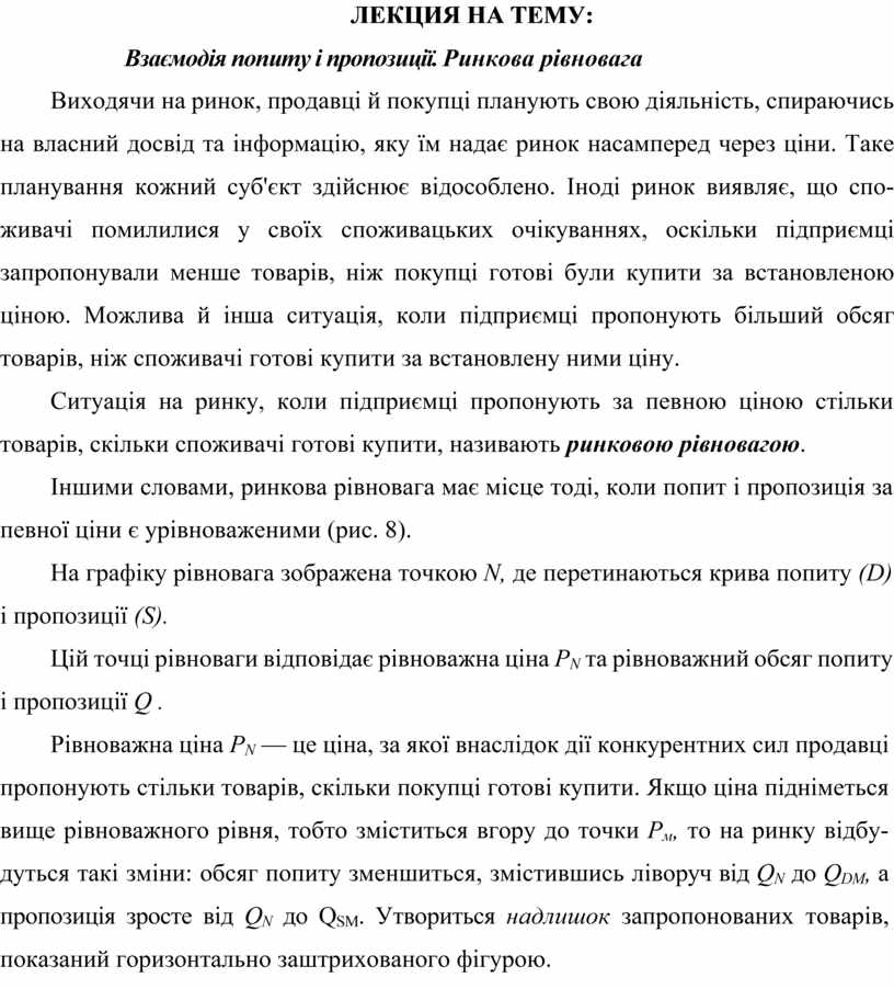 Рівноважна ціна PN — це ціна, за якої внаслідок дії конкурентних сил продавці пропонують стільки товарів, скільки покупці готові купити. Якщо ціна підніметься вище рівноважного рівня, тобто зміститься вгору до точки Рм, то на ринку відбудуться такі зміни: обсяг попиту зменшиться, змістившись ліворуч від QN до QDM, а пропозиція зросте від QN до QSM. Утвориться надлишок запропонованих товарів, показаний горизонтально заштрихованого фігурою.