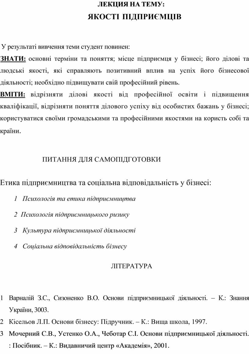 1 Варналій З.С., Сизоненко В.О. Основи підприємницької діяльності. – К.: Знання України, 3003.