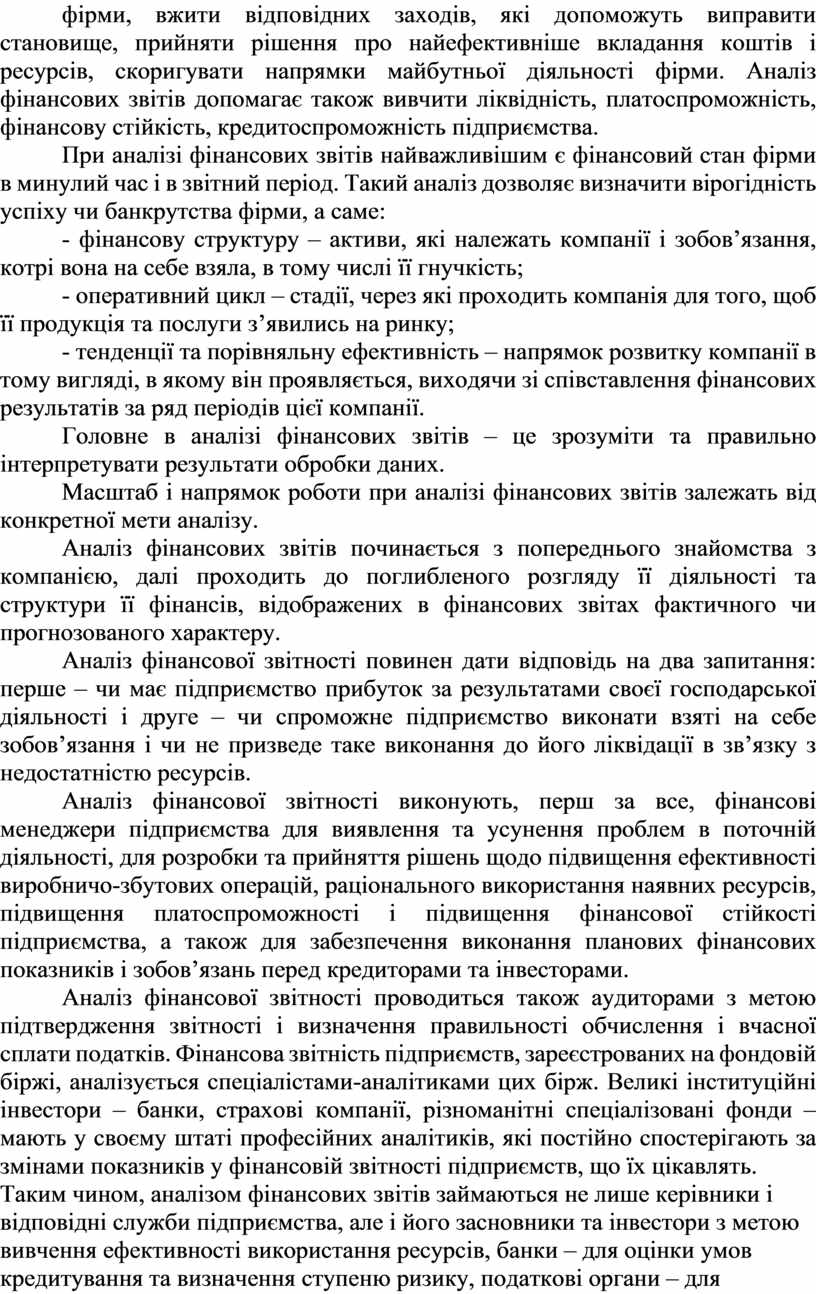 При аналізі фінансових звітів найважливішим є фінансовий стан фірми в минулий час і в звітний період. Такий аналіз дозволяє визначити вірогідність успіху чи банкрутства фірми, а саме: