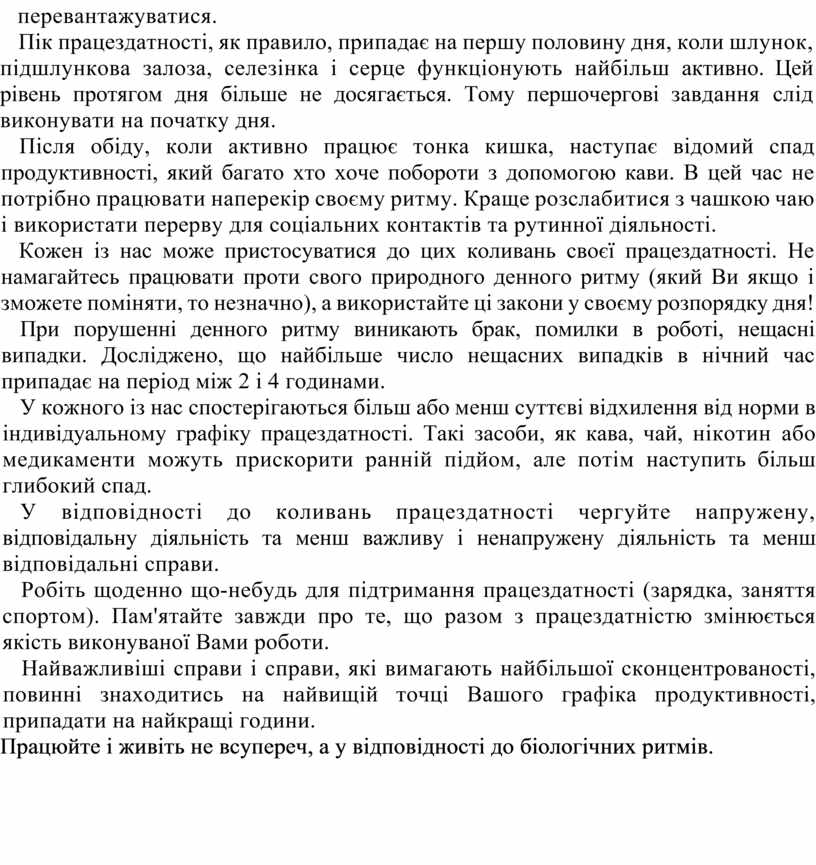 У відповідності до коливань працездатності чергуйте напружену, відповідальну діяльність та менш важливу і ненапружену діяльність та менш відповідальні справи.