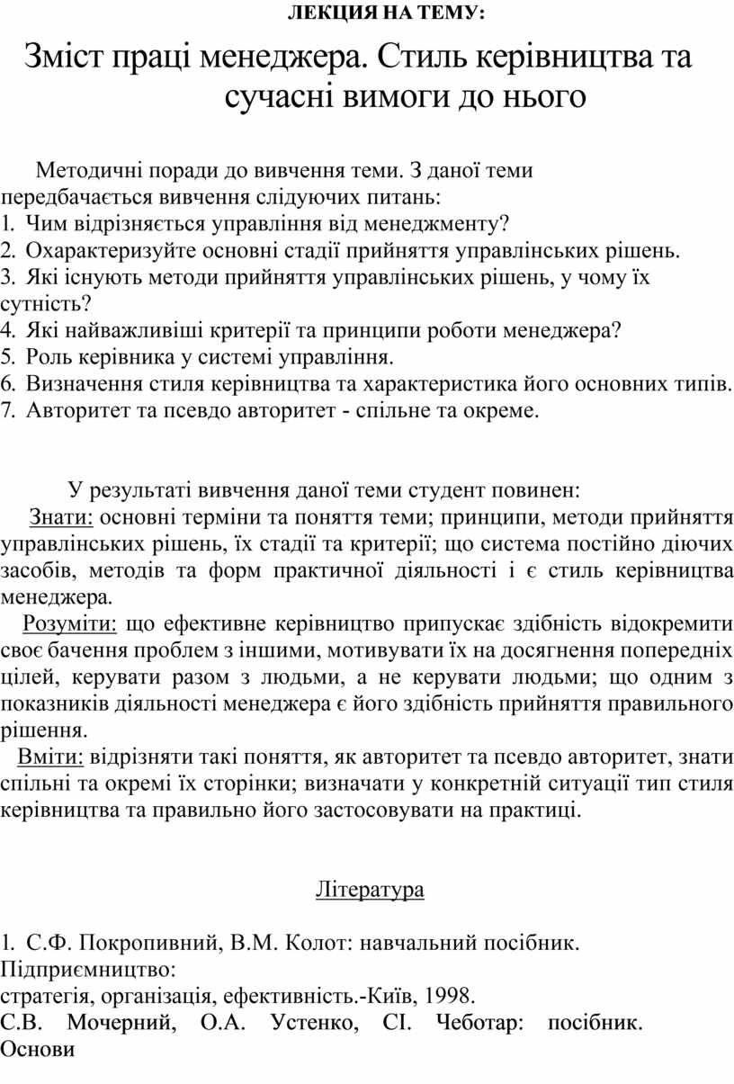 Зміст праці менеджера. Стиль керівництва та сучасні вимоги до нього
