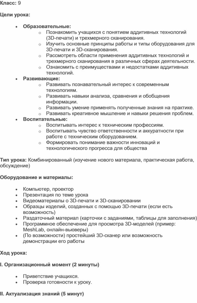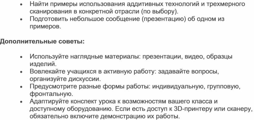 · Адаптируйте конспект урока к возможностям вашего класса и доступному оборудованию. Если есть доступ к 3D-принтеру или сканеру, обязательно включите демонстрацию их работы.