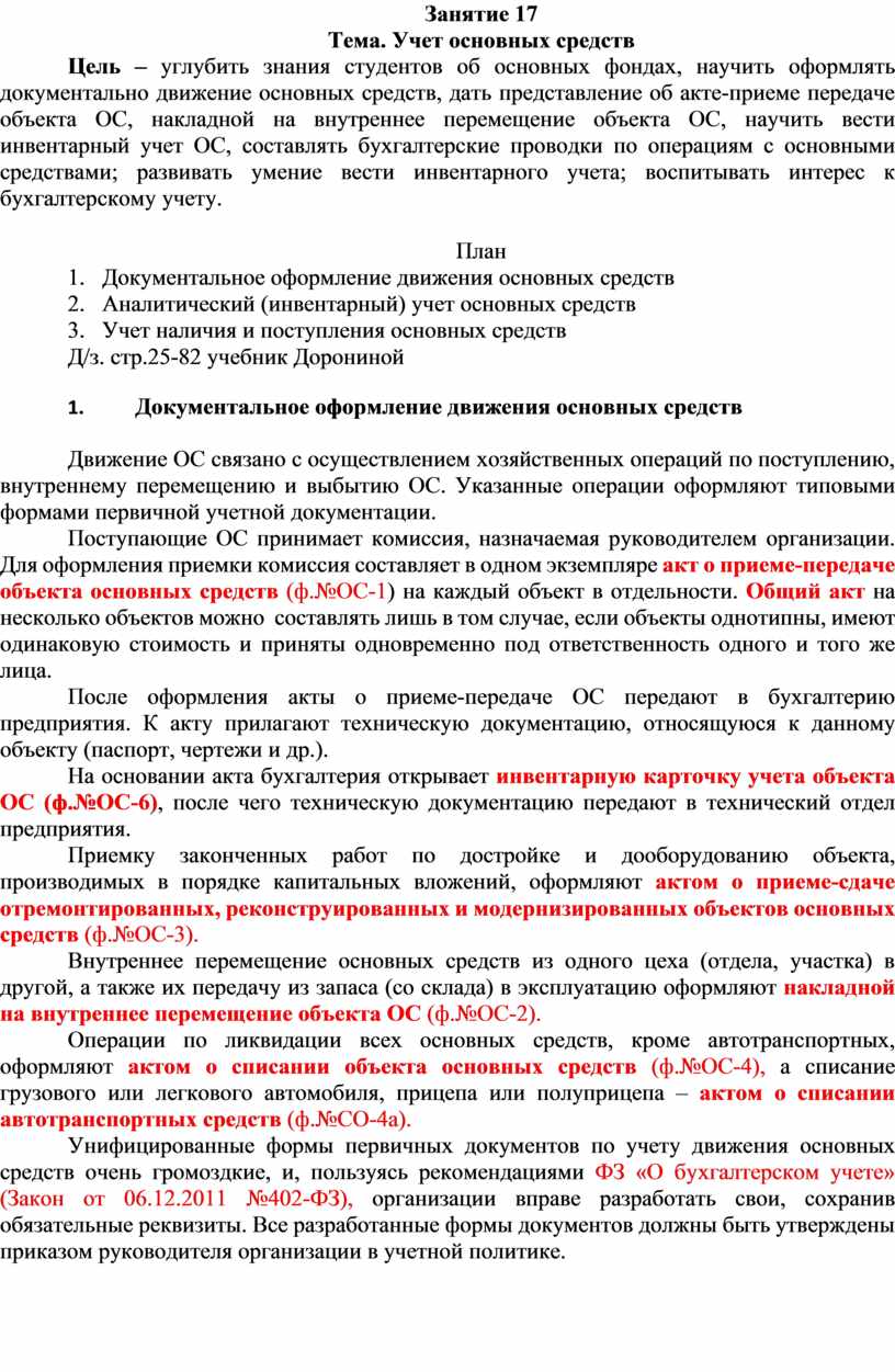 Цель – углубить знания студентов об основных фондах, научить оформлять документально движение основных средств, дать представление об акте-приеме передаче объекта ОС, накладной на внутреннее перемещение объекта ОС, научить вести инвентарный учет ОС, составлять бухгалтерские проводки по операциям с основными средствами; развивать умение вести инвентарного учета; воспитывать интерес к бухгалтерскому учету.