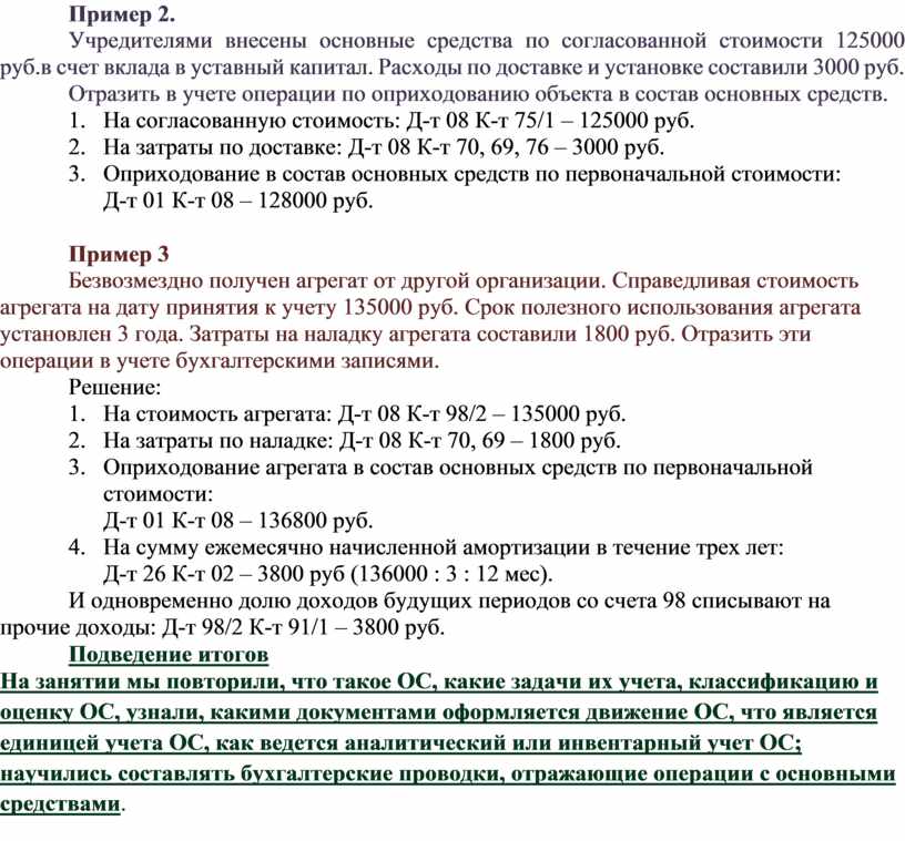 Учредителями внесены основные средства по согласованной стоимости 125000 руб.в счет вклада в уставный капитал. Расходы по доставке и установке составили 3000 руб.