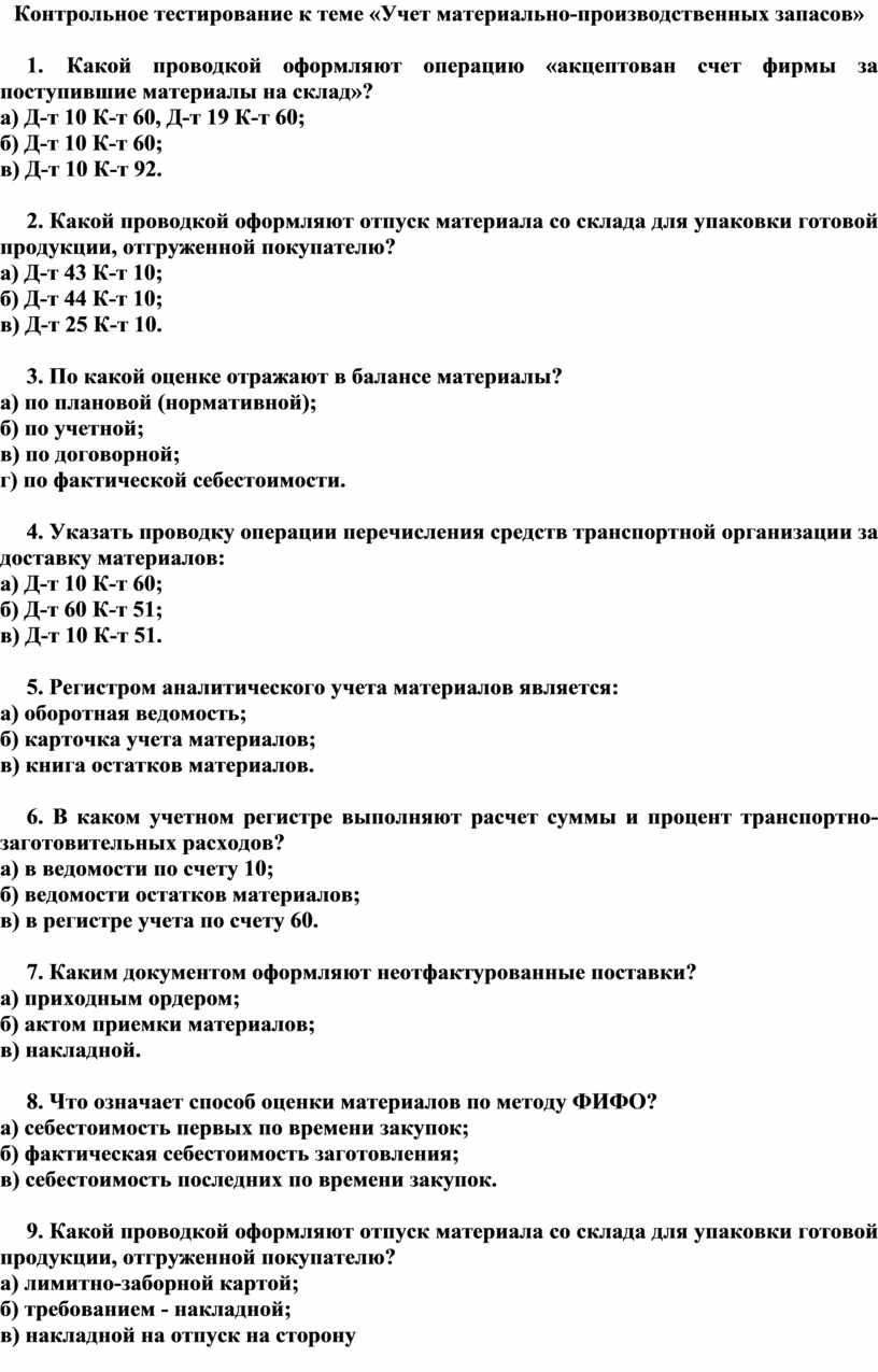 Контрольное тестирование к теме «Учет материально-производственных запасов»