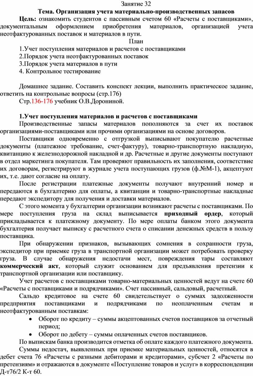 Цель: ознакомить студентов с пассивным счетом 60 «Расчеты с поставщиками», документальным оформлением приобретения материалов, организацией учета неотфактурованных поставок и материалов в пути.