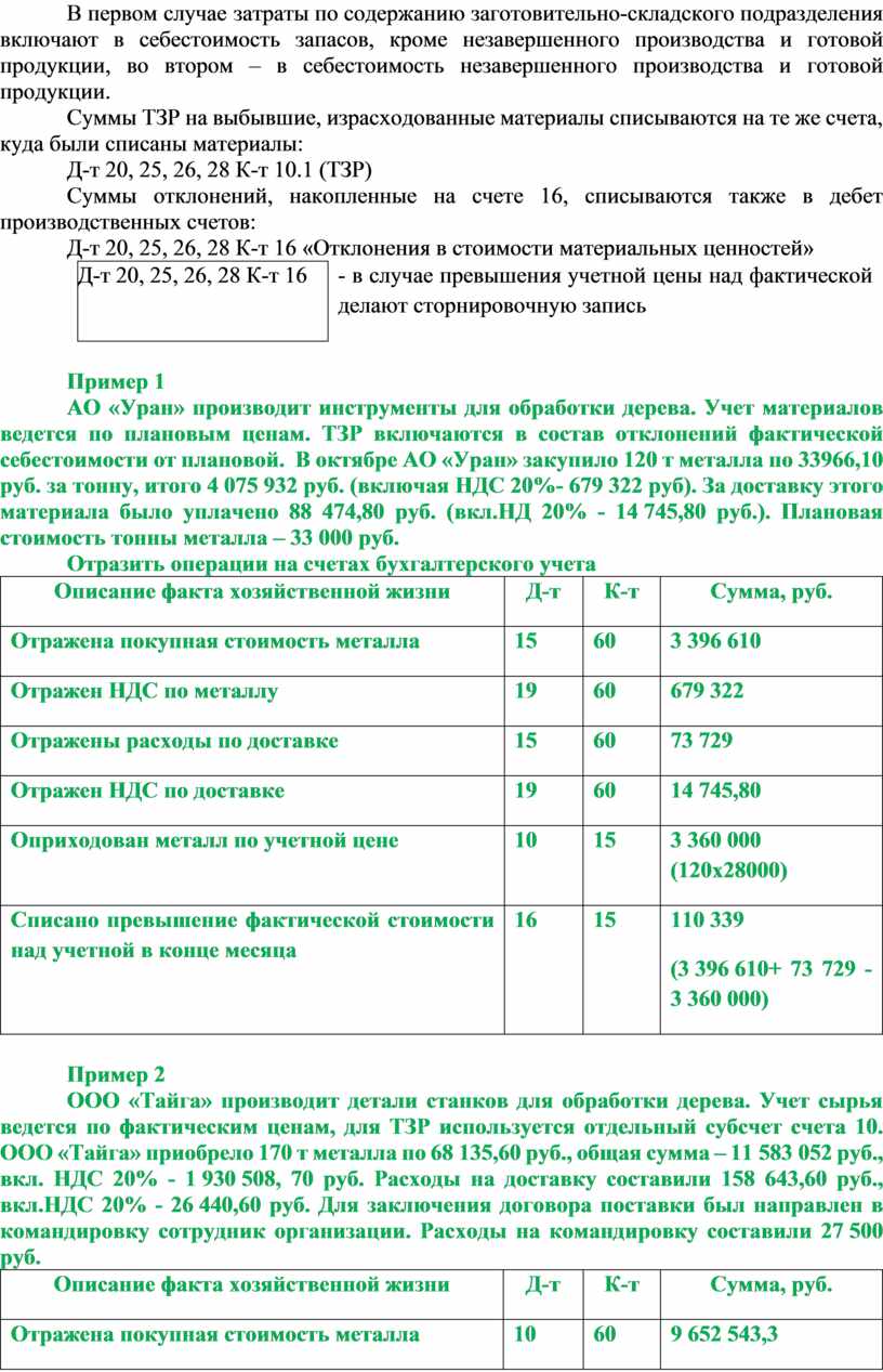 АО «Уран» производит инструменты для обработки дерева. Учет материалов ведется по плановым ценам. ТЗР включаются в состав отклонений фактической себестоимости от плановой. В октябре АО «Уран» закупило 120 т металла по 33966,10 руб. за тонну, итого 4 075 932 руб. (включая НДС 20%- 679 322 руб). За доставку этого материала было уплачено 88 474,80 руб. (вкл.НД 20% - 14 745,80 руб.). Плановая стоимость тонны металла – 33 000 руб.