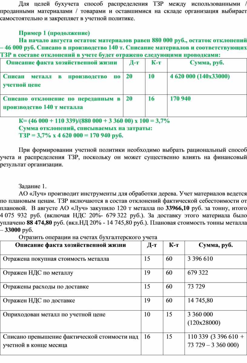 АО «Луч» производит инструменты для обработки дерева. Учет материалов ведется по плановым ценам. ТЗР включаются в состав отклонений фактической себестоимости от плановой. В августе АО «Луч» закупило 120 т металла по 33966,10 руб. за тонну, итого 4 075 932 руб. (включая НДС 20%- 679 322 руб.). За доставку этого материала было уплачено 88 474,80 руб. (вкл.НД 20% - 14 745,80 руб.). Плановая стоимость тонны металла – 33000 руб.