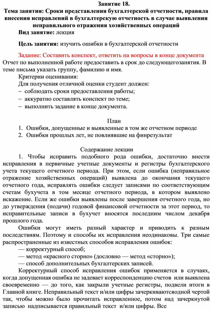 Тема занятия: Сроки представления бухгалтерской отчетности, правила внесения исправлений в бухгалтерскую отчетность в случае выявления неправильного отражения хозяйственных операций
