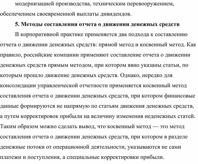 В корпоративной практике применяется два подхода к составлению отчета о движении денежных средств: прямой метод и косвенный метод. Как правило, российские компании применяют составление отчета о движении денежных средств прямым методом, при котором явно указаны статьи, по которым прошло движение денежных средств. Однако, нередко для консолидации управленческой отчетности применяется косвенный метод составления отчета о движении денежных средств, при котором финансовые данные формируются не напрямую по статьям движения денежных средств, а путем корректировок прибыли на величину изменения неденежных статей. Таким образом можно сделать вывод, что косвенный метод — это метод составления отчета о движении денежных средств, при котором в разделе денежные потоки от операционной деятельности, указываются не сами платежи и поступления, а специальные корректировки прибыли.
