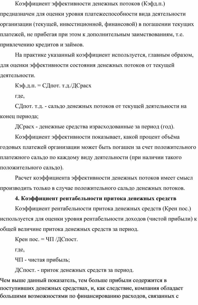 Коэффициент эффективности денежных потоков (Кэфд.п.) предназначен для оценки уровня платежеспособности вида деятельности организации (текущей, инвестиционной, финансовой) в погашении текущих платежей, не прибегая при этом к дополнительным заимствованиям, т.е. привлечению кредитов и займов.
