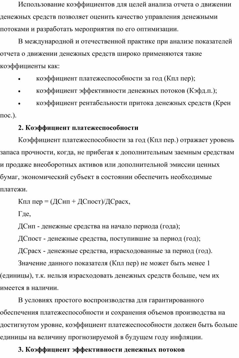 Использование коэффициентов для целей анализа отчета о движении денежных средств позволяет оценить качество управления денежными потоками и разработать мероприятия по его оптимизации.