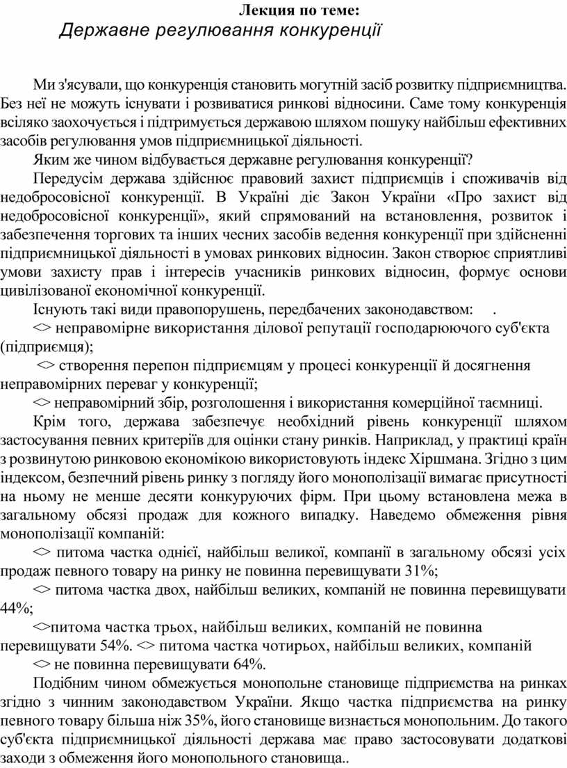 Крім того, держава забезпечує необхідний рівень конкуренції шляхом застосування певних критеріїв для оцінки стану ринків. Наприклад, у практиці країн з розвинутою ринковою економікою використовують індекс Хіршмана. Згідно з цим індексом, безпечний рівень ринку з погляду його монополізації вимагає присутності на ньому не менше десяти конкуруючих фірм. При цьому встановлена межа в загальному обсязі продаж для кожного випадку. Наведемо обмеження рівня монополізації компаній: