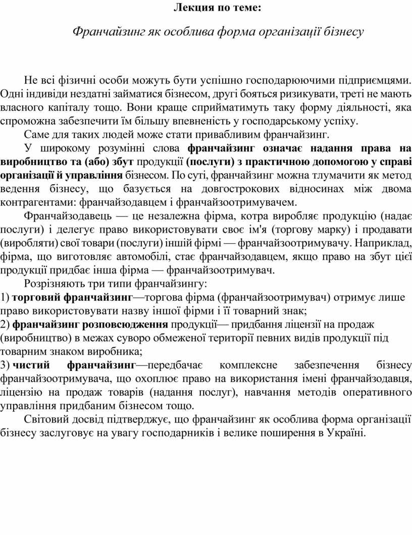 Світовий досвід підтверджує, що франчайзинг як особлива форма організації бізнесу заслуговує на увагу господарників і велике поширення в Україні.