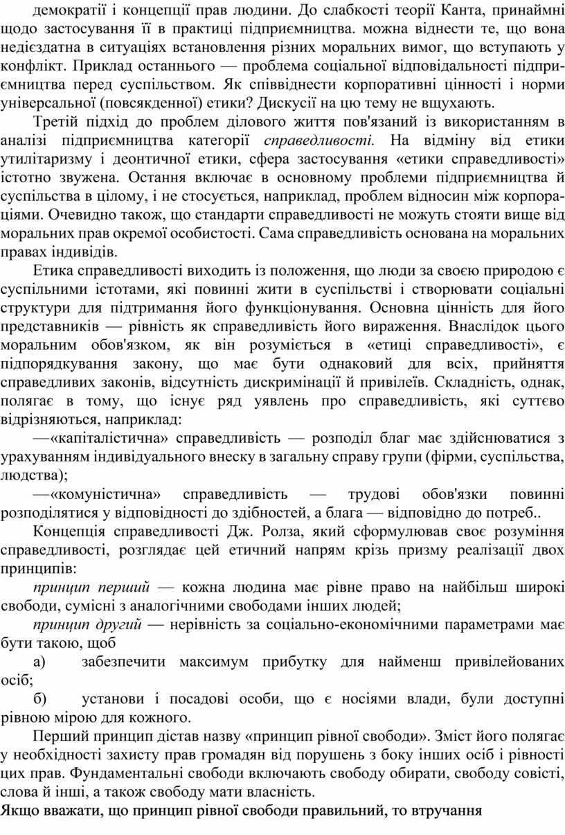 Третій підхід до проблем ділового життя пов'язаний із використанням в аналізі підприємництва категорії справедливості. На відміну від етики утилітаризму і деонтичної етики, сфера застосування «етики справедливості» істотно звужена. Остання включає в основному проблеми підприємництва й суспільства в цілому, і не стосується, наприклад, проблем відносин між корпораціями. Очевидно також, що стандарти справедливості не можуть стояти вище від моральних прав окремої особистості. Сама справедливість основана на моральних правах індивідів.