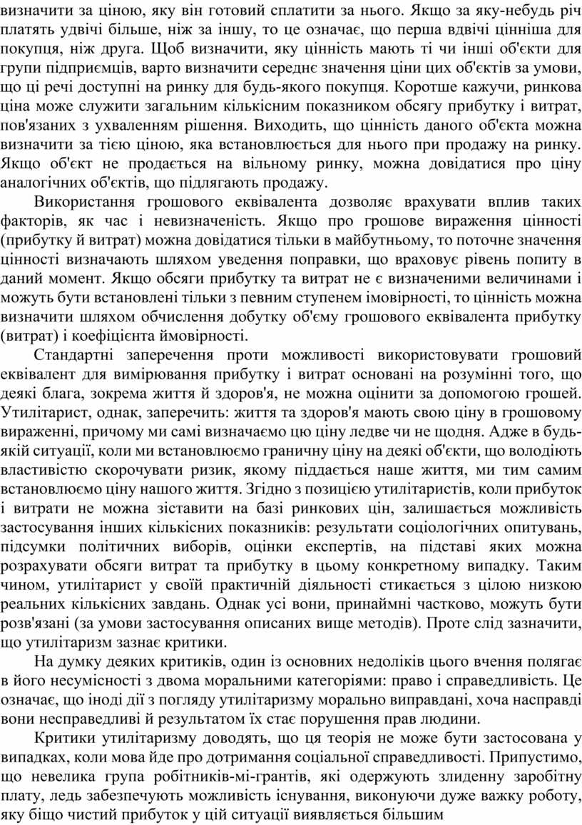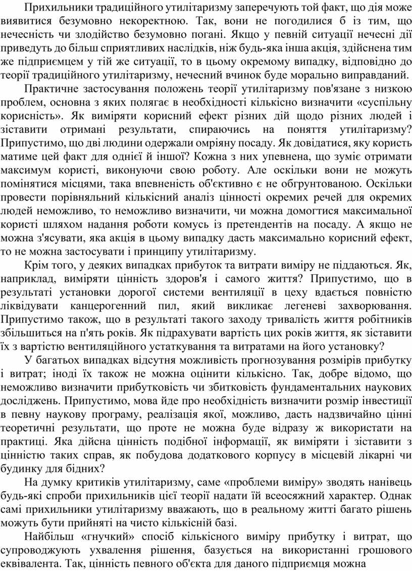 ніж збиток від страждань, яких зазнають люди, які належать до маленької групи сільськогосподарських робітників, і більшим, ніж був би чистий прибуток у випадку, якби цю роботу на фермі розподіляли рівномірно між усіма. Тоді, відповідно до теорії утилітаризму, збереження сільськогосподарськими робітниками статусу жебраків можна вважати справедливим із моральної точки зору. З погляду ж критиків теорії утилітаризму, соціальна система, що передбачає нерівномірність розподілу тягот буття, безперечно, аморальна і суперечить законам справедливості. Великий обсяг- прибутку, який така система дає більшості членів суспільства, зовсім не виправдовує того тягаря, що звалюється на плечі маленької групи населення. Теорія утилітаризму враховує лише корисність ефекту по відношенню до суспільства в цілому, але не погоджує цей результат із результатом розподілу отриманих благ між окремими індивідами.